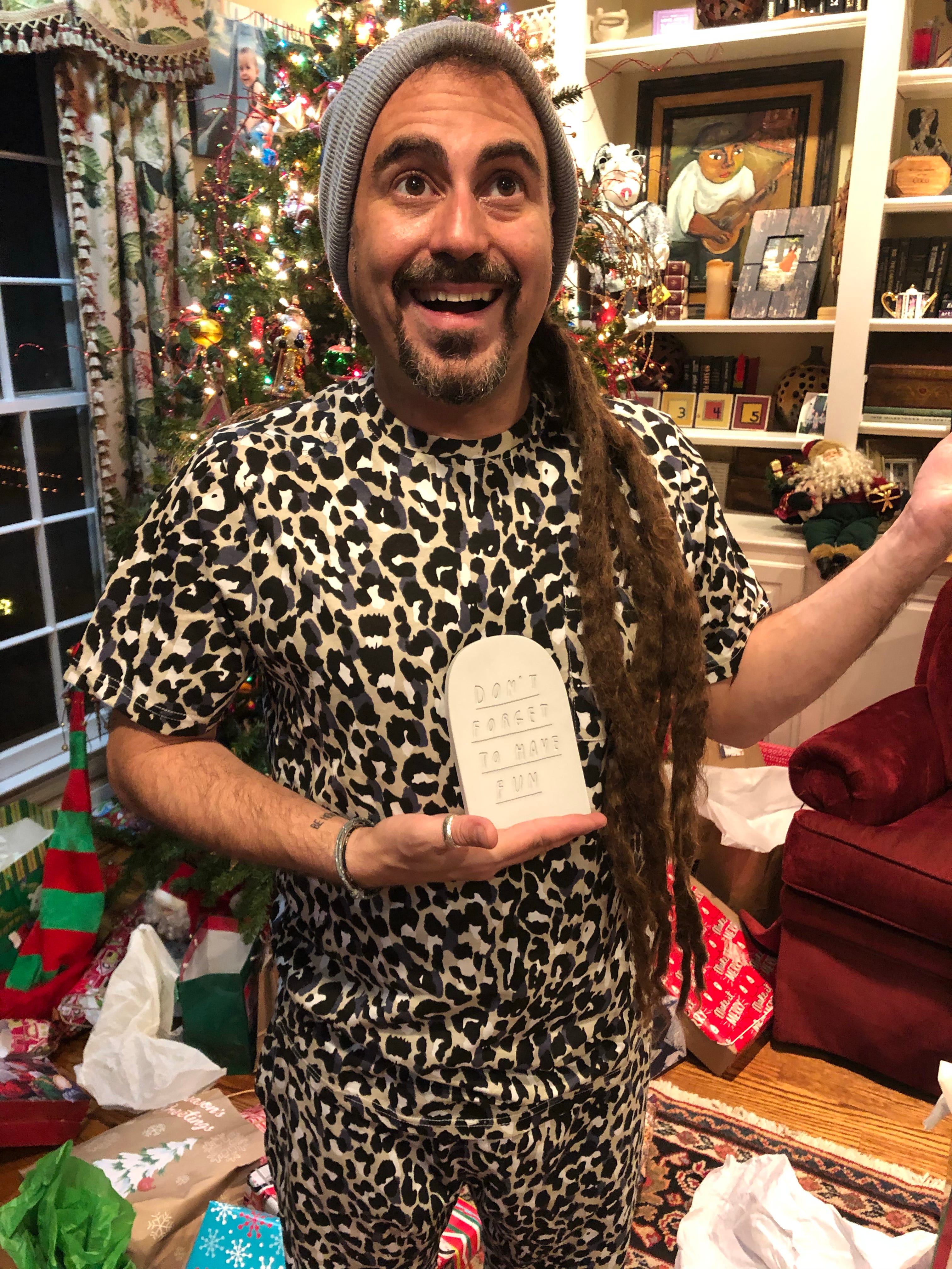 Here’s Faris posing wearing a Christmas present from Rosie’s mom Judy (yes, she picked those threads without any support) and with a Christmas present from Rosie: tombstone by Mr. Bingo with one of our life mottos: Don’t forget to have fun. Or as we often say, “It won’t be any good, if it isn’t any fun.”